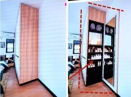 臥室的空間比較小,衣柜和床就把房間給填滿了。但是老婆的梳妝臺(tái)就沒(méi)有了。這個(gè)不用擔(dān)心,定制的衣柜側(cè)面可以往里挖10cm,這樣老婆的化妝品都可以擺放進(jìn)去,在安裝上一個(gè)柜門(mén),柜門(mén)里面也可以安裝一個(gè)全身鏡。